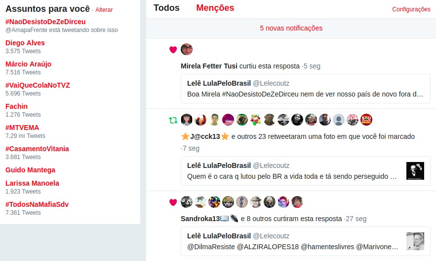 Na semana passada um grupo de militantes se juntaram e lançaram a Campanha “Resistência Zé Dirceu”. Eles chegaram a colocar a Tag #EuConfioEmZéDirceu em segundo lugar nos trends topis do Twitter. Naquela oportunidade, até a oposição que sempre disputa espaço na rede social, foi pega de surpresa e não conseguiram reagir. O feito virou notícias em grandes portais de notícias.