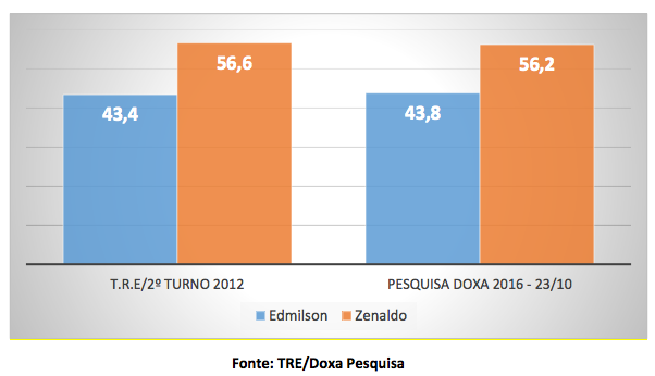 Edmilson aparece com 43,8% e Zenaldo 56,2%. A diferença dos números de 2012 (T.R.E) e da pesquisa DOXA é idêntica, com o único e quase imperceptivel detalhe: menos de meio porcento no resultado de Edmilson.