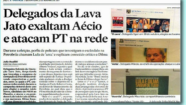 “Delegados federais da Operação Lava Jato, força-tarefa que investiga o esquema de corrupção na Petrobrás envolvendo empreiteiras e partidos, entre os quais o PT, usaram as redes sociais durante a campanha eleitoral deste ano para elogiar o senador Aécio Neves, candidato do PSDB ao Planalto, e atacar o ex-presidente Luiz Inácio Lula da Silva e sua sucessora, Dilma Rousseff, que disputava a reeleição.”