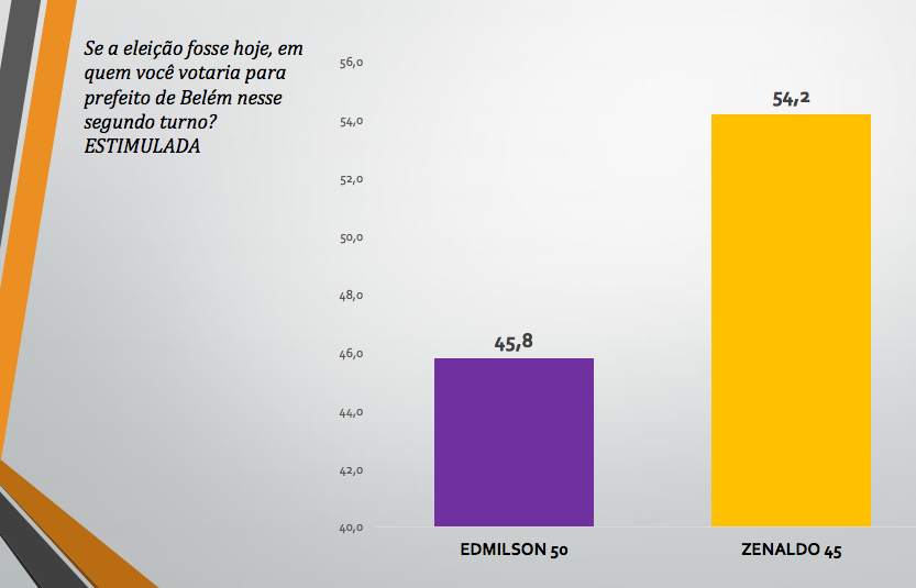 Na pesquisa estimulada, Extraídos os votos brancos, nulos e indecisos, Zenaldo (PSDB) aparece com 54,2% e Edmilson (PSOL) com 45,8% dos votos válidos.