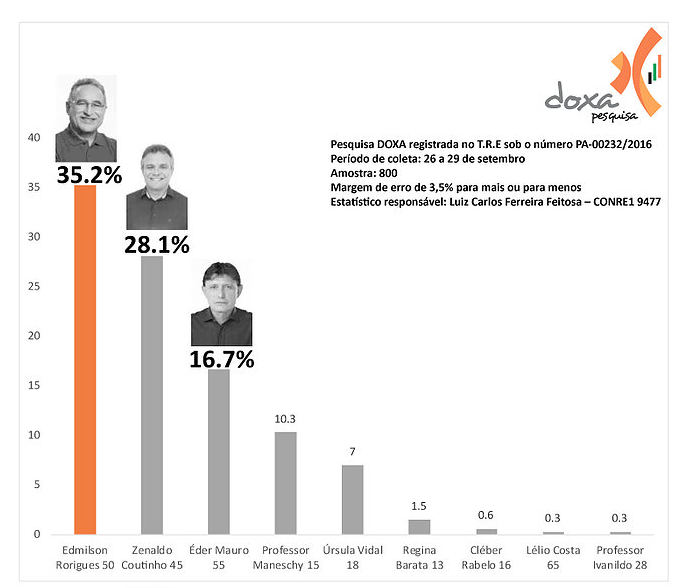 A pesquisa mostra que de acordo com os votos válidos, Edmilson (PSOL) tem 35,2%; Zenaldo Coutinho (PSDB) está em segundo lugar com 28,1%; Eder Mauro (PSD) aparece em terceiro lugar com 16,7%; professor Maneschi (PMDB) ficou com 10,3%. Úrsula Vidal (Rede) teve 7,0%; Regina Barata (PT) obteve apenas 1,5%. Os demais candidatos obtiveram menos de 1% das intenções de voto.