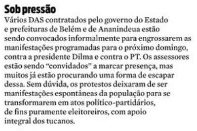 A notícia de quem o governador do Estado do Pará, Simão Jatene (PSDB) e os prefeitos de Belém, Zenaldo Coutinho (PSDB) e de Ananindeua, Manoel Pioneiro (PSDB) pressionam DAS´s do governo do Estado destas duas prefeituras, que são as maiores do Pará, para engrossar o ato contra Dilma, previsto para esta semana, confirma a suspeita de que os tucanos estão por de trás destas manifestações em apologia ao impeachment.