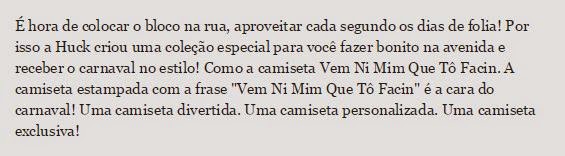 É hora de colocar o bloco na rua, aproveitar cada segundo os dias de folia! Por isso a Huck criou uma coleção especial para você fazer bonito na avenida e receber o carnaval no estilo! Como a camiseta Vem Ni Mim Que Tô Facin. A camiseta estampada com a frase "Vem Ni Mim Que Tô Facin" é a cara do carnaval! Uma camiseta divertida. Uma camiseta personalizada. Uma camiseta exclusiva!