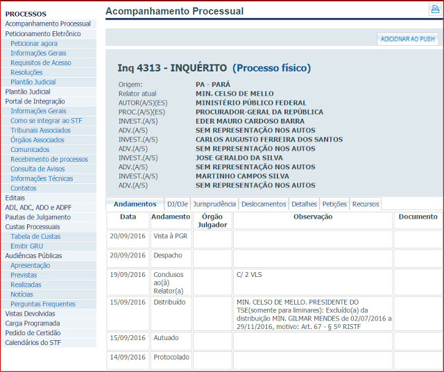 O inquérito, remetido pelo Tribunal de Justiça do Estado (TJE) para o Supremo, foi autuado no dia 15 deste mês e distribuído para a relatoria do ministro Celso de Mello, decano da Corte. No momento, está com vista para a Procuradoria Regional da República a partir desta terça-feira (20).