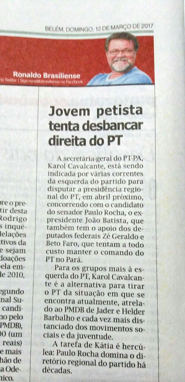 De forma atabalhoada e sem nenhum critério jornalístico, o jornalista Ronaldo Brasiliense, colunista do jornal O Liberal, usou trechos de uma publicação deste blog, para afirmar sem nenhuma confirmação da mesma, que a secretária geral do PT-PA, Karol Cavalcante "está sendo indicada por várias correntes para disputar a presidência regional do PT".