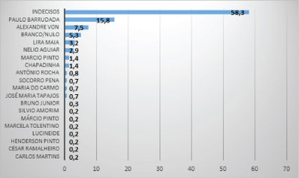 "Se a eleição fosse hoje o empresário de hotelaria, Paulo Barrudada, venceria a eleição", declara Dornélio Silva, diretor da Doxa, ao explicar ao blog AS FALAS DA PÓLIS que na questão espontânea em que não é apresentado nenhum nome ao entrevistado, Paulo Barruda aparece em primeiro lugar com 15,3%, em segundo Alexandre Von com 7,5% das intenções de voto; em terceiro Lira Maia, 3,2%; em quarto lugar Nélio Aguiar, 2,9%. Depois aparecem Márcio Pinto, Chapadinha, Antonio Rocha, Socorro Pena, Maria do Carmo, José Maria Tapajós dentre outros com índices abaixo de 0,3%. Os indecisos somam mais de 58%.