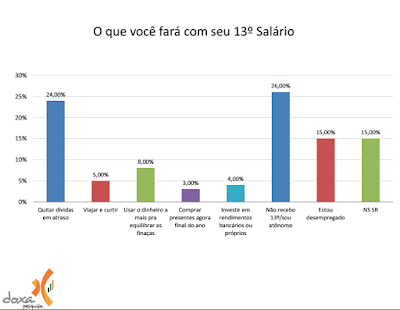 DESTINAÇÃO DO 13o SALÁRIO: Dos 600 entrevistados pela Doxa, 24% disseram que preferem quitar dívidas; 8,0% prefere usar o dinheiro a mais para equilibrar as contas. Apenas 3,0% disseram que usarão essa grana pra comprar presentes neste final de ano; 4,0% vão investir em negócios próprios ou bancários. Outros 26% disseram que não recebem 13%, isto é, são autônomos. Além destes, 15% estão desempregados. E 15,0% não sabem, ainda, o que fará com seu 13o.