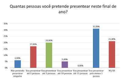O QUE MENOS GOSTARIA DE GANHAR: 23,0% dos entrevistados não gostariam de ganhar panettone neste final de 2016; 12,0% não querem DVDs; 10,0% não gostariam de ganhar par de meias; 9,0% chocolate; 5,0% higiene pessoal; 3,0% pijama; 2,0% utilidades domésticas; 2,0% chinelo; 1,0% roupas íntimas; 1,0% livros; 17,0% ainda não sabem.