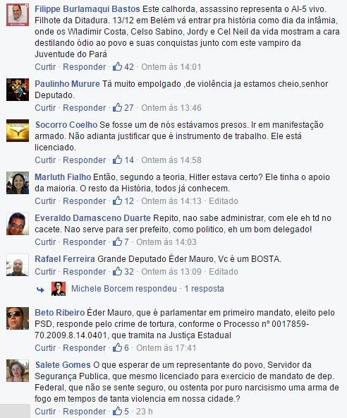 Em milhares de comentários, os internautas, em sua maioria, reprovam a conduta de Eder Mauro e o criticam duramente, tanto por sua atuação enquanto delegado, quanto como deputado.