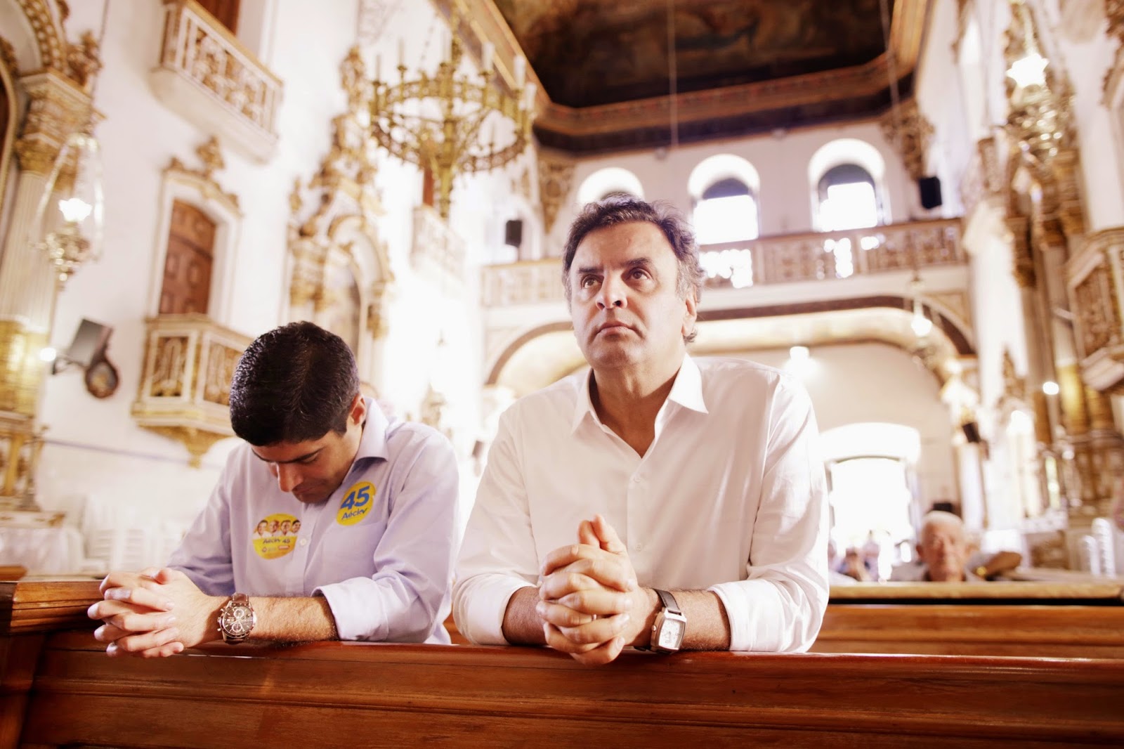 | Aécio Neves na igreja do nosso Senhor do Bonfin, em Salvador, ao lado de ACM Neto, roga por sua santificação. |