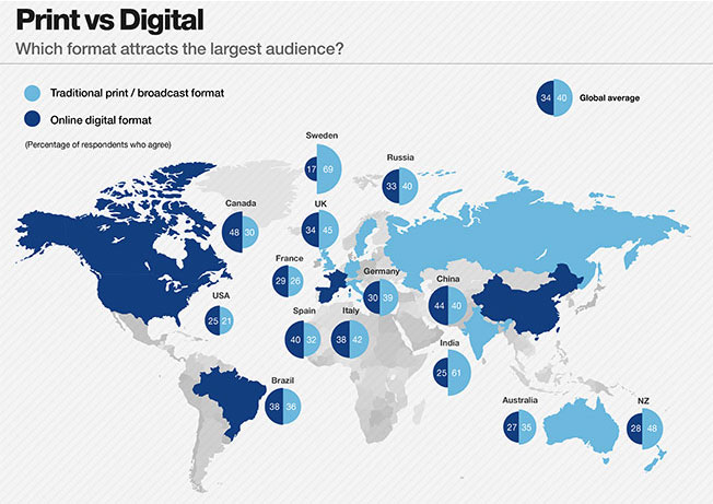 Canadá, Estados Unidos, Espanha, França, China e BRASIL dizem preferir o jornalismo digital, já Reino Unido, Suécia, Rússia, Alemanha, Itália, Índia e Austrália dizem preferir o jornalismo feito por televisão e impresso. A pesquisa ficaria muito mais rica se separasse cada plataforma de mídia individualmente.