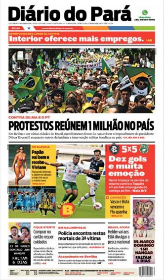 Capa do jornal Diário do Pará desta quinta-feira, um dia após as manifestações de rua em todo o Brasil, que levaram milhares de pessoas para enfrentar a chuva e o cansaço de um dia de trabalho para a maioria e de viagem para outros que vieram de várias cidade do interior, lutar contra o Impeachment da presidente Dilma.