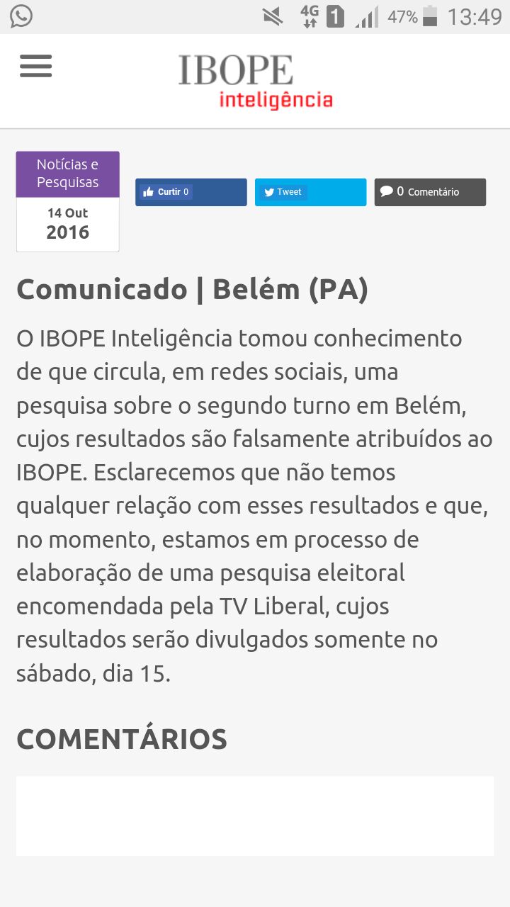 Para dar um ar de legitimidade, os fraudadores utilizaram o número de registro da última pesquisa publicada pelo IBOPE em Belém e divulgada nas vésperas do primeiro turno das eleições 2016.