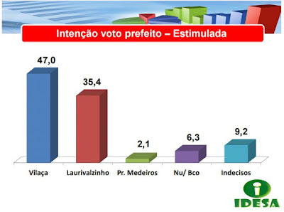 A nova pesquisa realizada pelo Instituto IDESA, em Barcarena, demostra que com 47% das intenções de voto, Vilaça segue na liderança na preferência do eleitor. Em segundo lugar, Laurivalzinho vem com 35,4% e Pr. Medeiro ocupa a terceira posição com 2,1%. Os votos nulos e brancos totalizam 6,3% e os indecisos somam 9,2% dos entrevistados.