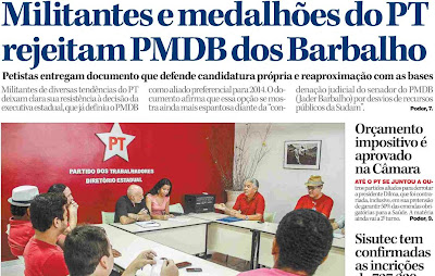 14 de Agosto de 2013, 10:15 - sem comentários aindaCapa de O Liberal Jornal destaca a reunião promovida ontem por militantes petistas contrários a aliança com o PMDB já no 1º turno das eleições de 2014, tal como quer alguns dirigentes do partido no Pará. |