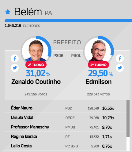 A pesquisa mostra que de acordo com os votos válidos, Edmilson (PSOL) tem 35,2%; Zenaldo Coutinho (PSDB) está em segundo lugar com 28,1%; Eder Mauro (PSD) aparece em terceiro lugar com 16,7%; professor Maneschi (PMDB) ficou com 10,3%. Úrsula Vidal (Rede) teve 7,0%; Regina Barata (PT) obteve apenas 1,5%. Os demais candidatos obtiveram menos de 1% das intenções de voto.