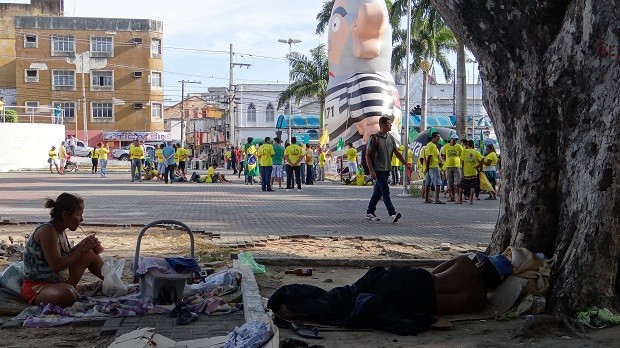 | Com protesto ao lado, morador de rua dorme na Praça dos Martírios, em Maceió, no dia 12/11/2015. Foto: Karina Dantas/G1. |