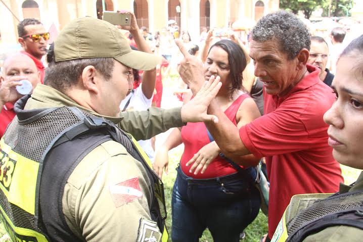 | Após o confronto, a PM isolou os dois grupos e o ato prosseguiu normalmente, finalizando com o "beijaço" em favor da democracia e contra o golpe. Foto: Frente Brasil Popular-PA. |