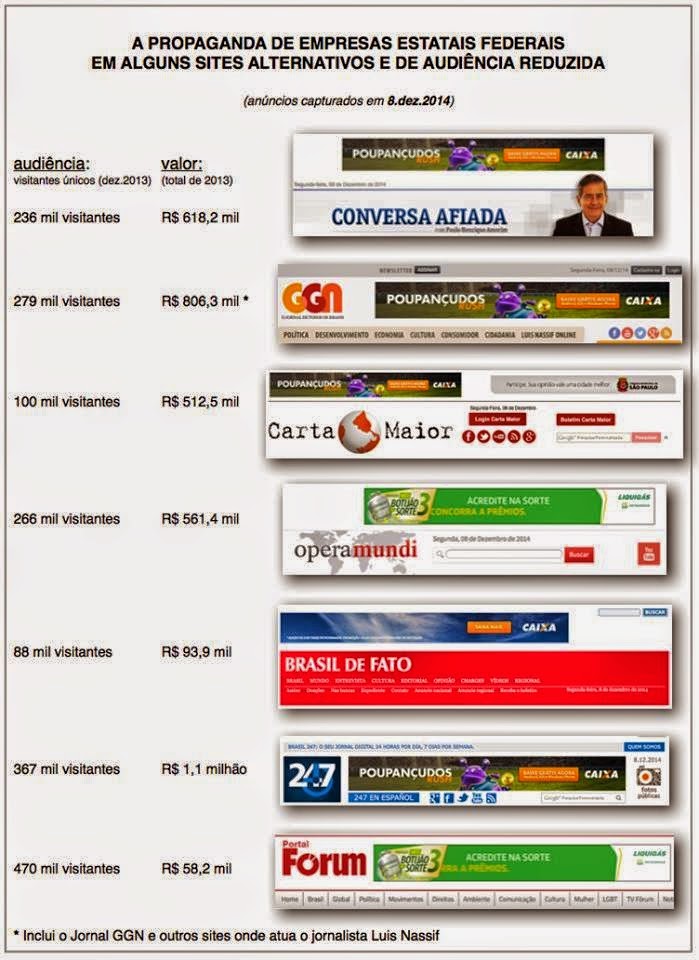 AS FALAS DA PÓLIS, que no (fraco) mês passado teve uma audiência de cerca de quase meio milhão de visitantes (Blog e Funpage), lembra que tanto Lula, quanto o ex-ministro das comunicações, Ricardo Berzoini chegaram a defender regulamentação da mídia em entrevista a blogueiros e que neste período de 13 anos, o número de empresas e veículos de comunicação que receberam verbas de publicidade da União, pulou de 4.398 em 2000 (governo FHC) para 10.817 (governo Dilma), ou seja, mais que o dobro.