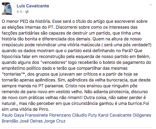 Já em apoio a Paulo Gaya, o ex-secretário de Educação, no governo de Ana Júlia, Luis Cavalcante disparou: