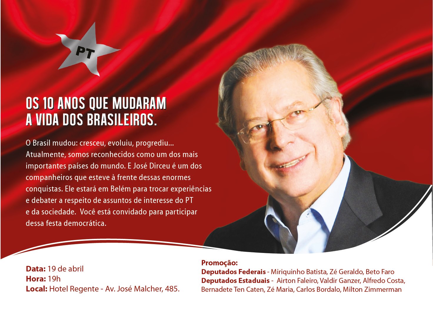 Em foco, neste debate, os nomes dos petistas BETO FARO e PAULO ROCHA como prováveis candidatos do PT ao governo do Estado. Em preparação a esta discussão do alto comando petista, BETO FARO reuniu sua coordenação no sábado, 13/04, para reafirmar que deseja ser o candidato majoritário do partido em 2014.