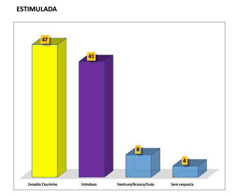 Quando se estimula, isto é, são apresentados aos entrevistados os nomes dos candidatos, Zenaldo Coutinho permanece em primeiro lugar com 47% e Edmilson Rodrigues continua em segundo lugar com 41% Os votos flutuantes (branco, nulo e indecisos) somam 12%.