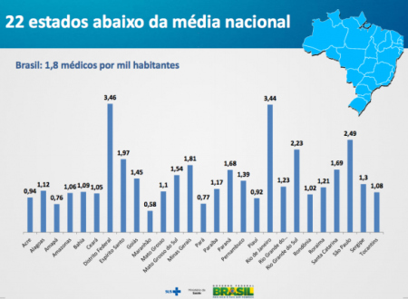 | 22 dos 27 estados brasileiros estão abaixo da média nacional de 1,8 médico por mil habitantes, |
