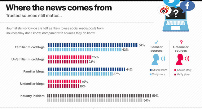 No próximo gráfico, fica claro que, apesar do crescimento da importância de blogs e microblogs como fonte de informação, a fonte, a pessoa e a origem continuam sendo importantes elementos para o jornalismo.