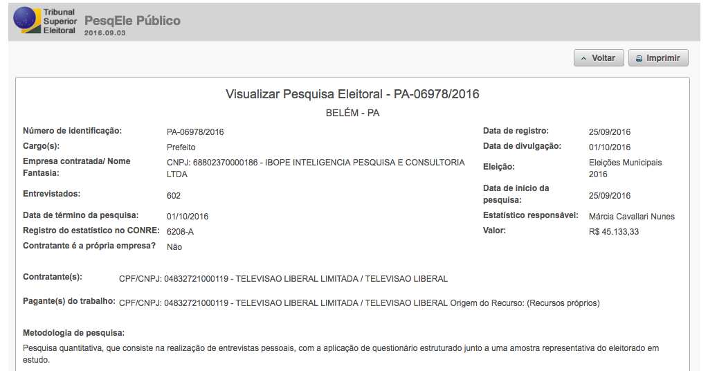 Para dar um ar de legitimidade, os fraudadores utilizaram o número de registro da última pesquisa publicada pelo IBOPE em Belém e divulgada nas vésperas do primeiro turno das eleições 2016.