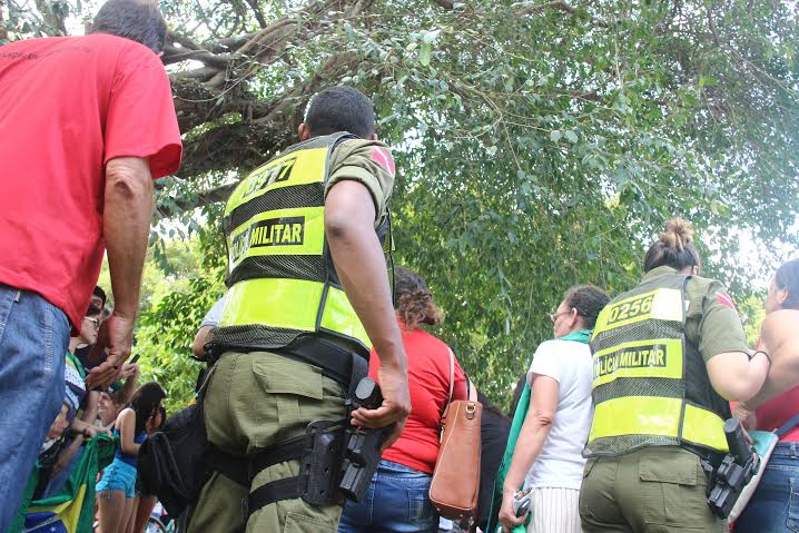 | Após o confronto, a PM isolou os dois grupos e o ato prosseguiu normalmente, finalizando com o "beijaço" em favor da democracia e contra o golpe. Foto: Frente Brasil Popular-PA. |