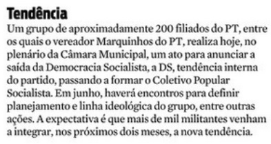 A notícia encontrada na coluna Repórter Diário, do jornal Diário do Pará deste sábado (30), revela a ruptura do grupo do ex-vereador Marquinho, historicamente ligado à DS - Democracia Socialista, tendência interna do PT dirigida no Estado do Pará pela ex-governadora Ana Júlia e os ex-deputado federal Cláudio Puty.