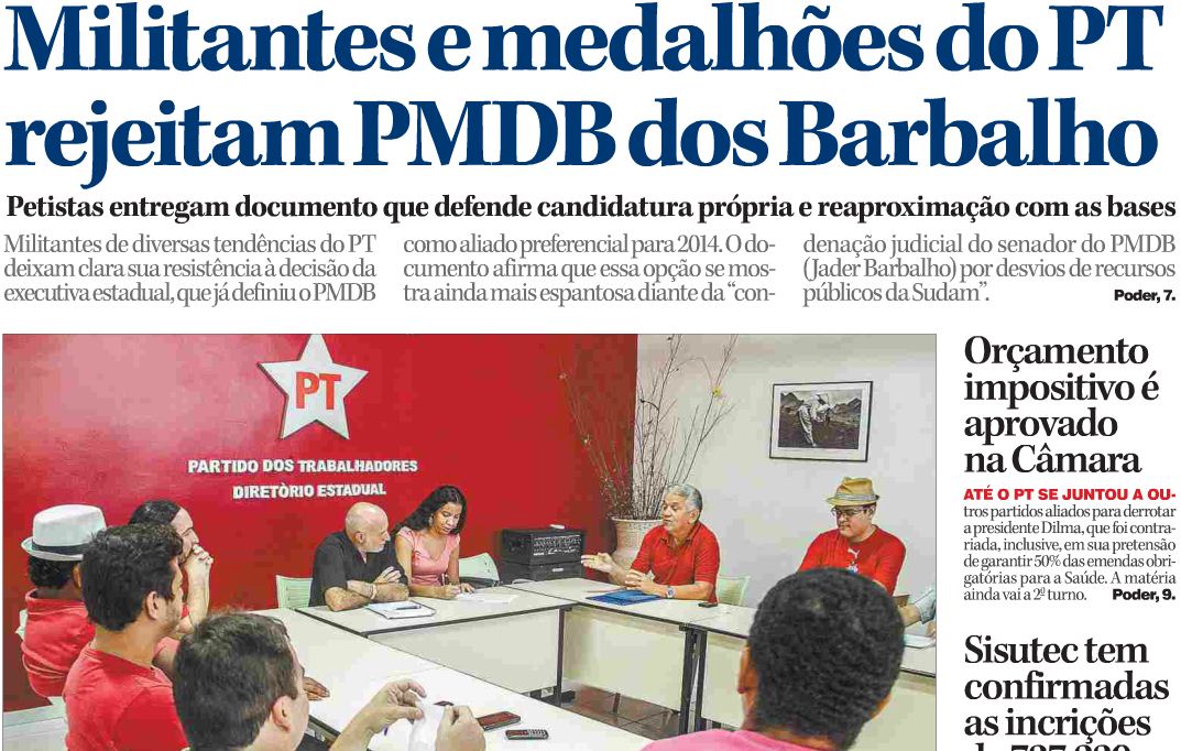 “É mais espantoso, ainda, que essa possibilidade seja cogitada logo após a condenação judicial do senador do PMDB (Jader Barbalho) por desvios de recursos públicos da Sudam e as manifestações de rua ocorridas no mês de junho de 2013, que questionaram as nossas envelhecidas instituições políticas”, expressa o documento subscrito por 51 militantes do PT, e que conta com o apoio de mais de cem filiados nas redes sociais. Para Luiz Carlos Cavalcante, ex-secretário de Educação do Governo Ana Júlia e filiado ao PT há 30 anos, o partido tem condições de disputar as eleições com candidato próprio.