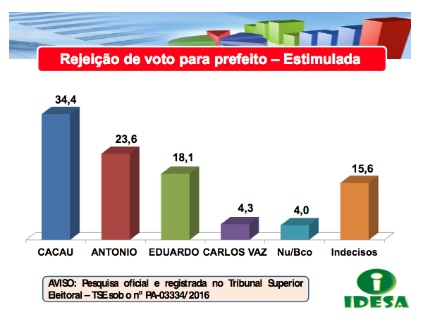 Cacau é o mais rejeitado com 34,4%; Antônio Doido tem a segunda maior rejeição, 23,6%, seguido por Eduardo 18,1% e Carlos Vaz com 4,3%. Brancos e Nulos 4,0% e Indecisos com 15,6%.