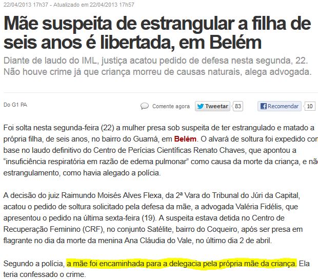 апреля 22, 2013 21:00 - no comments yetAgora como viram que o laudo definitivo apontou para morte natural, diz-se que a mãe era suspeita. Porque não usaram a palavra "suspeita" antes?Quando foi pra acusar, a imprensa estampou que a mãe havia matado de forma cruel e (joga pedra na Geni) tals, tals..
