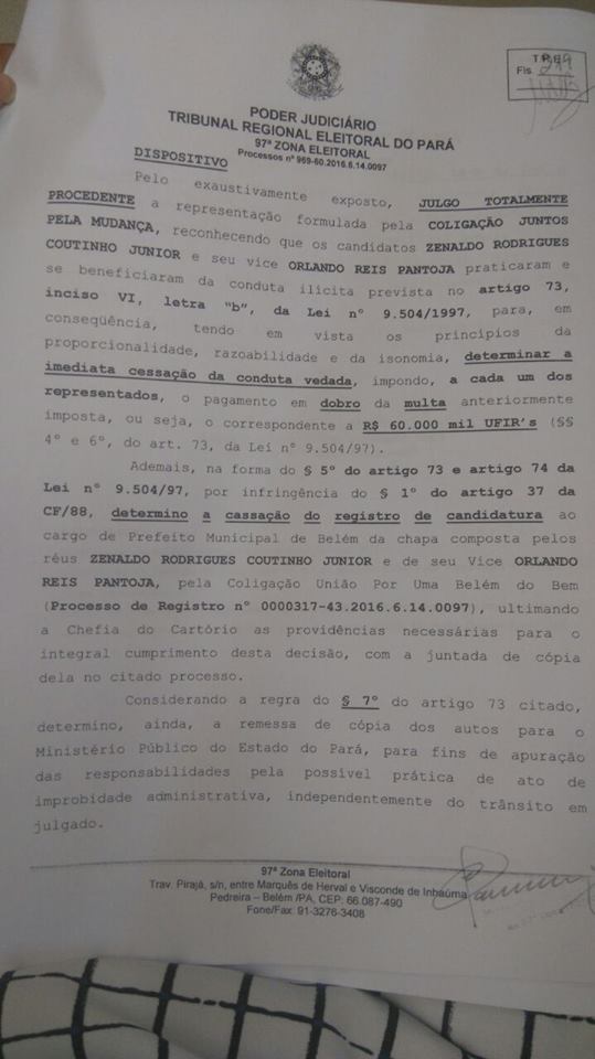 Circula pelas redes sociais um despacho do juiz da 97a Zona Eleitoral, Antônio Cláudio Cruz, onde o TRE-PA determina a cassação da candidatura do atual prefeito de Belém, Zenaldo Coutinho (PSDB).
