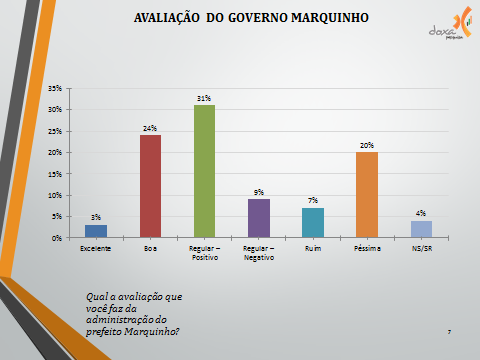 A pesquisa revela que se a eleição fosse hoje, Marquinho (PSD) teria 41,0% das intenções de voto. Seu principal adversário, Henrique (PT) chegaria com 32,0% dos votos. O candidato do PPS, José Nunes, ficaria com 3,0%. Os votos branco e nulo somam 4,0%; e os indecisos são 20,0%.