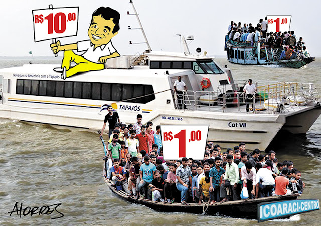 Ao elogiar a iniciativa do prefeito Zenaldo Coutinho (e de sua secretária da Semob, doutora em "mobilidade urbana") em promover inauguração festiva de uma linha fluvial urbana Icoaraci/Belém de um barco só (vejam na foto de Adriano Magalhães, da Agência Belém), e ao salgado preço de R$ 10, renomado colunista "por dentro" dos fatos festeja o alcaide dizendo que ele descobriu um verdadeiro "Ovo de Colombo" . Como é que ninguém pensou nisso antes? - deveria também ter perguntado o ilustre jornalista.