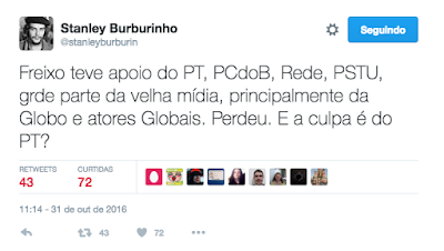 "O próximo que disser que o PSOL está assumindo o vácuo deixado pelo PT na disputa eleitoral vai ganhar um curso de análise de dados. Não estou comemorando a derrota do PSOL no Rio ou em qualquer lugar. Pedi voto ao Freixo no primeiro e no segundo turno e tenho certeza de que o PSOL apresenta o melhor projeto para a cidade do Rio de Janeiro (e para Belém, para Sorocaba, etc). O meu ponto é que o PSOL não está ocupando o espaço que foi um dia do PT. Quem está fazendo isso é a direita e os partidos ligados ao pentecostalismo. Vimos isso no primeiro e no segundo turno em todo o país. E não há nada a comemorar. E sei que muitos militantes do PSOL fazem essa mesma leitura da conjuntura. Muitos, não todos, infelizmente", concluiu Thandara.