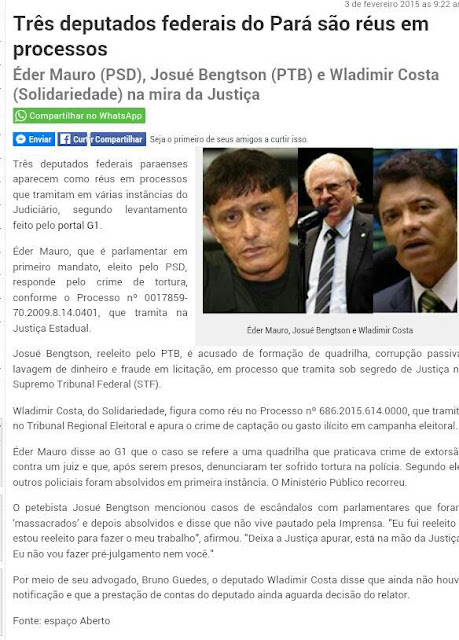O jornalista Paulo Bemerguy publicou em seu blog, a informação de que Eder Mauro e mais dois deputados federais do Pará respondem por crimes na justiça, o que pode ser confirmado no levantamento feito pelo site G1.