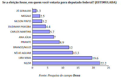 Pesquisa realizada pelo Instituto Doxa na segunda quinzena de novembro/2013 na região Oeste do Pará para aferir a intenção de voto para deputado estadual e federal aponta os seguintes resultados: