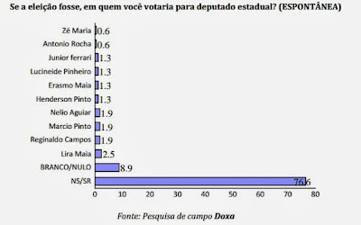 Na pergunta espontânea em que não é apresentada nenhuma lista de candidatos a deputado estadual, o índice de pessoas que não sabem indicar algum nome chega a 76,6% e os que votariam nulo ou branco soma 8,9%. Os nomes que aparecem são de Lira Maia em primeiro, Reginaldo Campos, Márcio Pinto, Nélio Aguiar, Henderson Pinto, Erasmo Maia, Lucineide Pinheiro, Júnior Ferrari, Antônio Rocha e Zé Maria.