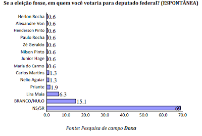 Na pergunta espontânea para deputado federal, o índice de quem são soube indicar algum nome é de 69%; 15,1% anulariam eu voto ou votariam em branco. Dos que aparecem, o atual deputado federal Lira Maia aparece em primeiro lugar com 6,3% seguido de Priante com 1,9%. Nélio Aguiar e Carlos Martins vêm empatados com 1,3%. Os demais nomes que aparecem tem índices de 0,6%, conforme gráfico abaixo.