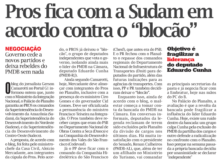 O jornal O Liberal trouxe a repercussão de que um dos poucos espaços do governo federal onde petistas paraenses ainda ocupam espaços de destaque, está preste a ser entregue pro PROS, após acordo de reforma ministerial. As informações estão no blog do Gerson Camarotti, no Portal IG.