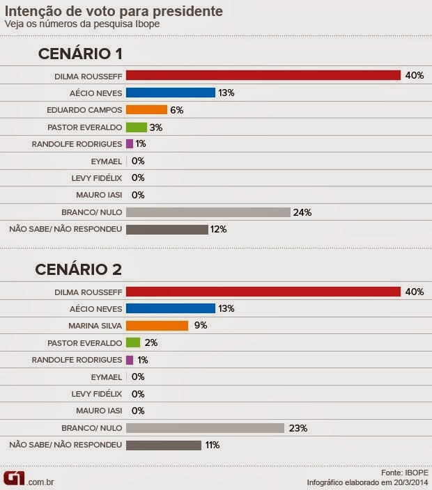 Pesquisa Ibope divulgada nesta quinta-feira (20) atribui 40% das intenções de voto para a presidente Dilma Rousseff se a eleição presidencial fosse hoje. O segundo colocado é o senador Aécio Neves (PSDB-MG), que aparece com 13%, e o terceiro, o governador de Pernambuco, Eduardo Campos (PSB), com 6%. Pastor Everaldo (PSC) registrou 3% e o senador Randolfe Rodrigues (PSOL), 1%. Os demais possíveis postulantes – Eymael (PSDC), Levy Fidelix (PRTB) e Mauro Iasi (PCB) – não pontuaram.