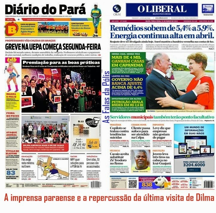 A manchete da capa foi sobre o início da greve na Universidade do Estado, marcado para segunda-feira, pelo motivo óbvio de causar desgaste ao governador Simão Jatene, inimigo da “casa” e do PMDB. Internamente o jornal deu três quartos de página para o noticiário sobre Dilma Rousseff.