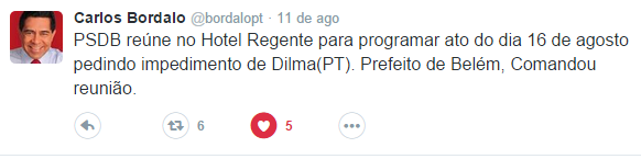 Ontem, uma reunião em um hotel de luxo em Belém, reuniu diversas lideranças do PSDB para traçar o plano de investir pesado no ato e tentar induzir o povo paraense ir às ruas pedir o impeachment da presidenta Dilma, que está cumprindo o 8º mês de seu mandato, conforme foi decidido nas eleições presidenciais do ano passado.