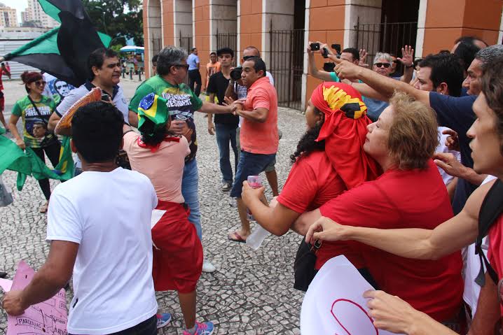 Imagens registradas neste domingo (1º), tanto por manifestantes, quanto por veículos de imprensa, na praça da República em Belém do Pará, mostram um confronto entre manifestantes que participavam do ato convocado pela Frente Brasil Popular e a Frente Povo sem Medo e um grupo de fascista que chegaram ao local com provocações e entoando palavras de ordem, exaltando o nome do deputado federal Jair Bolsonaro (PSC-RJ).