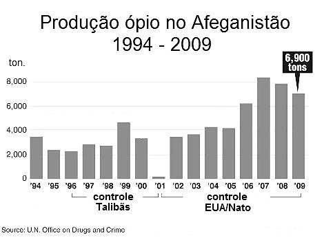 produção era o objectivo básico por trás da campanha dos EUA no Afeganistão. Neste aspecto, a missão no País tem sido um sucesso: a heroína é comprada e transmitida pela CIA e o Pentágono para outros Países; depois de ter construído bases militares no Quirguistão, Uzbequistão e Tajiquistão e com a implementação do governo de H. Karzai, Washington abriu novas rotas de abastecimento, eliminando concorrentes e certificando-se de que a capacidade das instalações de processamento do ópio nunca tivessem falta de trabalho.