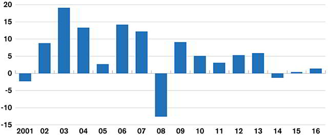 Mudanças anuais na riqueza global nos anos 2000 - 2016 |