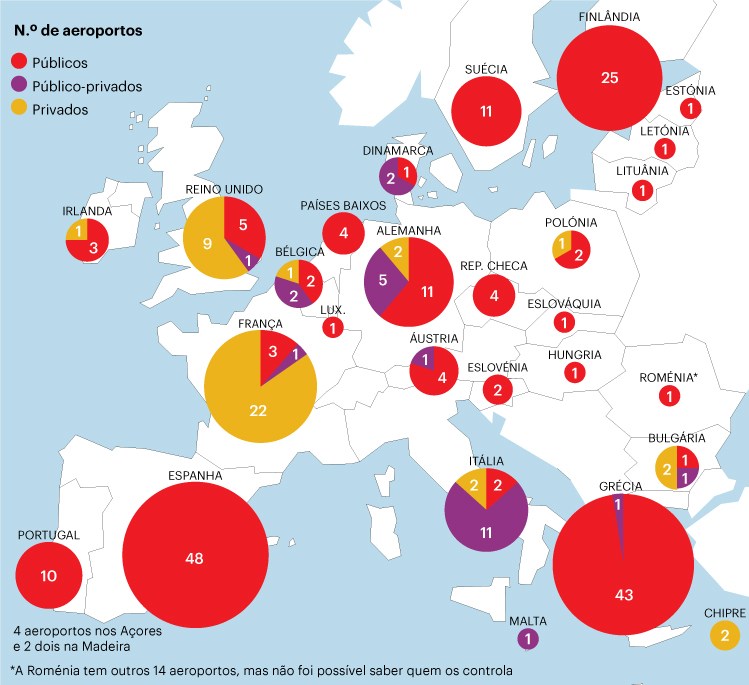 Para ter uma ideia do que acontece no resto da Europa, podem observar o mapa publicado acima. Ao que parece, os outros Estados são obstinados e continuam a manter a propriedade de pelo menos 1 aeroporto nacional. Quem sabe qual a razão. E quem sabe como fazem, pois é evidente que um aeroporto significa só prejuízos, caso contrário o governo não teria vendido tudo.
